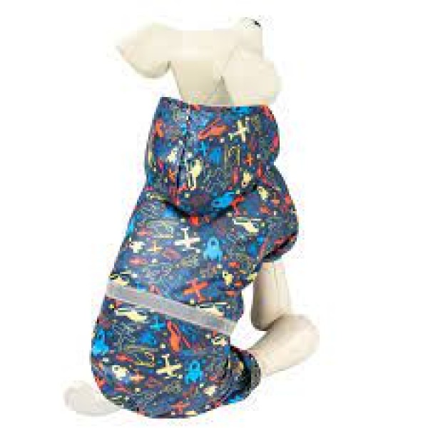 Костюм-дождевик "Полет" - это удобный и функциональный аксессуар для собак, который просто незаменим в дождливую погоду. Изделие защитит шерсть животного от дождя и грязи, а непродуваемая ткань - от сильного ветра. Костюм имеет стильный дизайн, а универсальный фасон не стесняет движений питомца во время прогулки. Особенностью дождевика является светоотражающая лента, идущая по талии изделия, - для повышения безопасности животного на дороге. Дождевик также имеет капюшон и фиксируется при помощи трех заклепок на животе, а на штанинах предусмотрены удобные резинки, препятствующие попаданию грязи и влаги снизу.