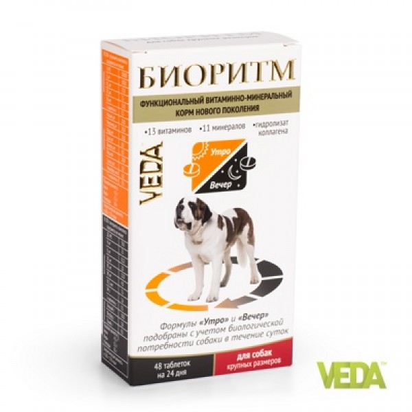 Биоритм – витаминно-минеральный комплекс, в состав которого входят только полностью усваиваемые формы витаминов и минералов; они разделены на 2 приема в разное время суток с учетом биологических потребностей организма и взаимного влияния компонентов; состав соответствует реальной суточной потребности собак с массой более 30 кг с учетом потребления коммерческих кормов. В состав комплекса введен гидролизат коллагена, являющегося строительным материалом для хряща.