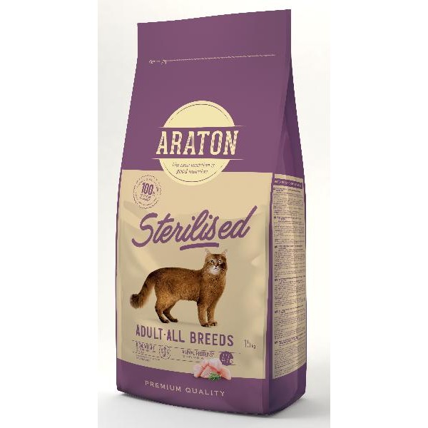 Araton Cat Sterilization - это сухой корм для взрослых стерилизованных кошек от 1 года и старше. Рекомендуется для кошек, прошедших стерилизацию/кастрацию и склонных к прибавке в весе.