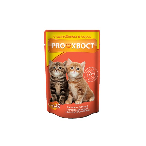 Консервы для котят proхвост — с цыпленком в соусе — это полнорационное сбалансированное питание для котят до года. Корм разработан с учетом всех питательных потребностей растущих котят. Содержит высококачественные натуральные ингредиенты, белки, жиры, углеводы, витаминно-минеральный комплекс и таурин.
