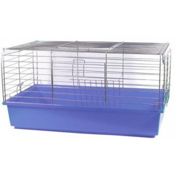 Крашеная металлическая-пластмассовая клетка, предназначенная для кроликов.
