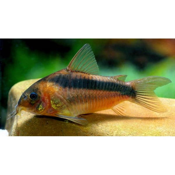 Коридорас Рабо или Оранжевый (Рыжий) Коридорас.Взрослые особи достигают в длину около 5–6 см. Основная окраска оранжевая цвета ржавчины, по верхней части тела проходит широкая тёмная полоса, тянущаяся от головы до хвоста. Плавники полупрозрачные без рисунка. Эти сравнительно небольшие сомики предпочитают держаться группами, поэтому рекомендуется приобретать стайку от 5 особей, которая с комфортом разместится в аквариуме от 40–50 литров.